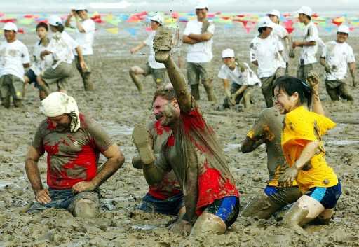 People play in the mud during the opening of a park on Xiushan Island, Daishan county, east China's Zhejiang province, Saturday 16 July 2005. About 2,000 tourists came to witness the opening of China's first mud-theme park on the beach. The sea mud on the beach, rich in minerals and salts, have positive effects on skin and rheumatism, park organizers said. EPA