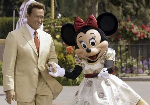 Disneylândia fez ontem 50 anos. California governor Arnold Schwarzenegger (L) is escorted by Minnie Mouse at Disneyland in Anaheim, California as part of Disneyland's 50th birthday party Sunday, 17 July 2005. Disneyland opened exactly 50 years ago today, 17 July 1955. Governor Schwarzeneggers' approval rating is at it's lowest since taking office. EPA