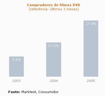 O número de compradores de filmes em DVD tem aumentado nos últimos anos, passando de 9.9% em 2003 e de 17.0% em 2004 para os 27.9% agora verificados - quase três vezes mais do que em 2003.